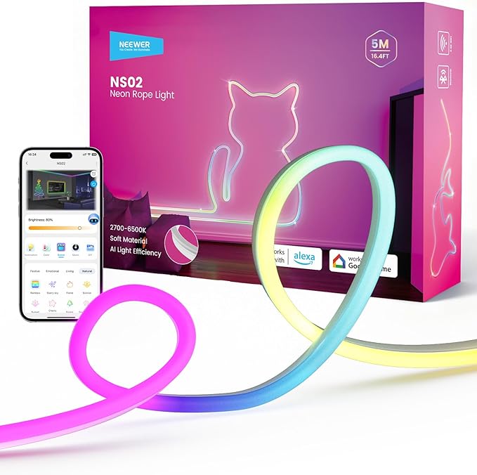 - 【Bright & Flexible Silicone Strip Light】 The NS02 neon LED strip is made of pure waterproof silicone, soft, flexible, and easy to bend, allowing easy installation in bedrooms, corners, eaves, along walls, or inside wardrobes. The side emitting RGB strip produces bright, natural, and colorful linear light that highlights architectural lines, adding elegant accents and creating a dreamy, inviting home ambiance