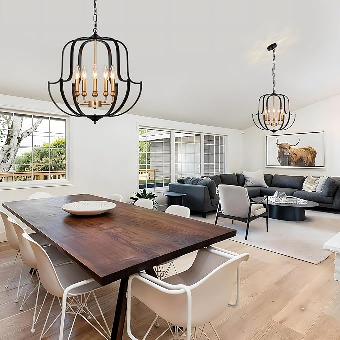 - 【E12 Bulb Bases & Dimmable】The black and gold pendant light equipped with 5 UL-listed sockets, ensuring ample illumination while prolonging the lifespan of your chandelier for entryway. Its classic E12 base is compatible with LED, CFL, halogen, and incandescent bulbs. The black chandelier supports dimmable bulbs and dimmer switches to meet your needs, creating a comfortable home lighting environment
