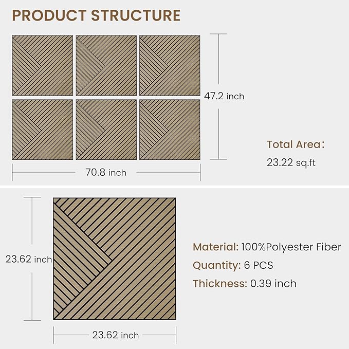 • Upgraded PVC Film Surface Design: Our acoustic panels feature upgraded PVC wood-grain finish (note: not solid wood), showcasing a stylish classic stripe pattern with the modern aesthetic of real wood veneer. Unlike generic 3D sound panels, our wall panels combines art and function to enhance your decor while absorbing excess noise