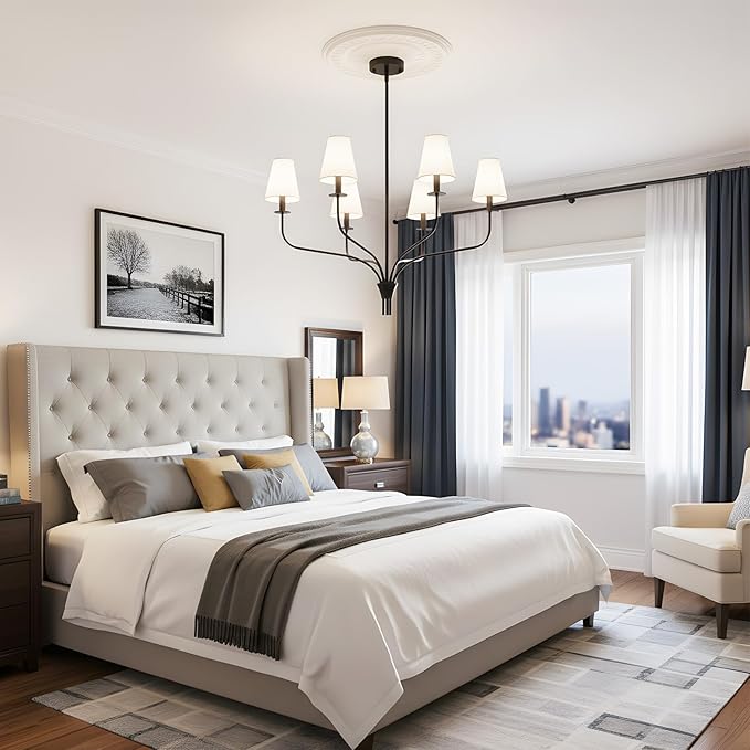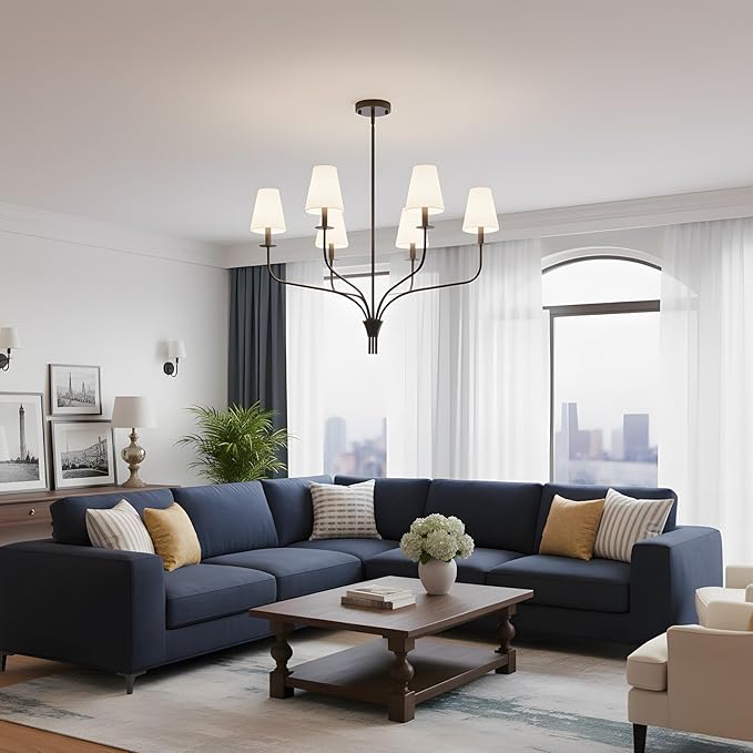 30" Modern Black Chandelier for Dining Room - 6-Light Pendant Lighting Fixture with White Fabric Shade, Mid Century Ceiling Light for Living Room Bedroom Kitchen Island, E12