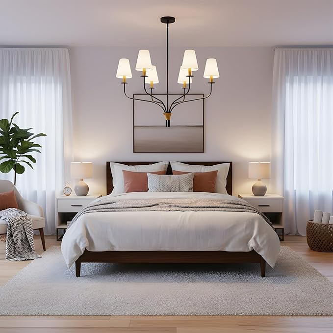 30" Modern Black and Gold Chandelier for Dining Room, 6-Light Mid Century Pendant Light with White Fabric Shade, Contemporary Ceiling Lighting for Living Room Bedroom Kitchen Island, E12