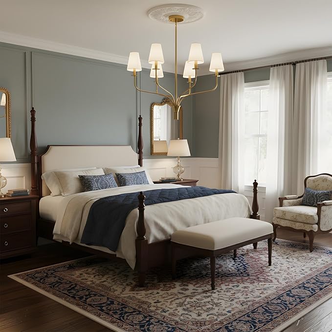- 💡【Modern Chandelier Design】 This candlestick pendant gold chandelier features a modern light fixture design with a sleek polished gold body and elegant white linen shades, inspired by a "Hand Bouquet." Perfect for enhancing your dining room decor with a contemporary yet warm ambiance.