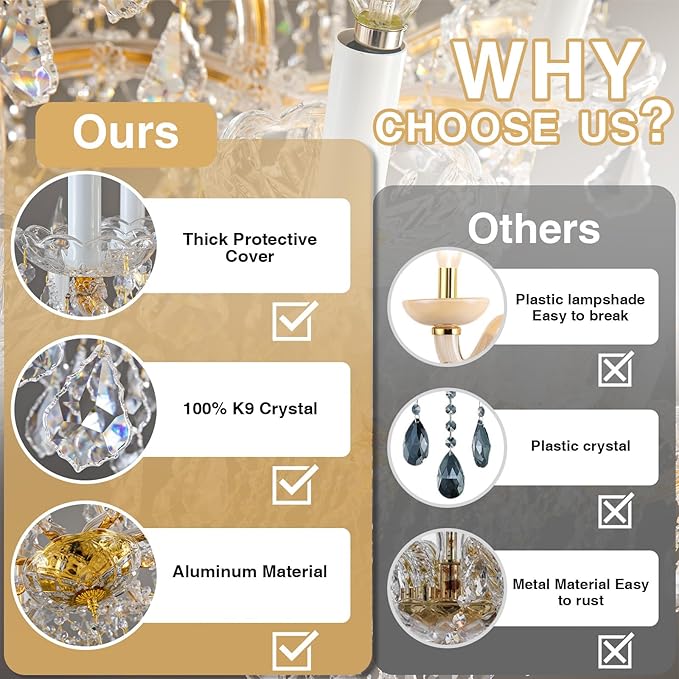 - 【18 Lighting Large Crystal Chandelier】This foyer chandelier features hand-picked, high-quality K9 crystal. Its body is crafted from thick, rust-resistant aluminum. The design is both modern and classic, making it a perfect finishing touch for your home remodel. Ideal for high ceilings. This chandelier for living room requires 18 x E12 bulbs(Bulbs not included), Additionally it is dimmable.