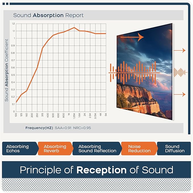 - đ»ăSound Absorbingă Our art acoustic panels which can easily and effectively reduce reverberation diffusion and echo, absorbing noise for walls. Effectively improve your sound environment and quality.Absorption Frequency: 150-20000HZ.It has better effect than acoustic foam
