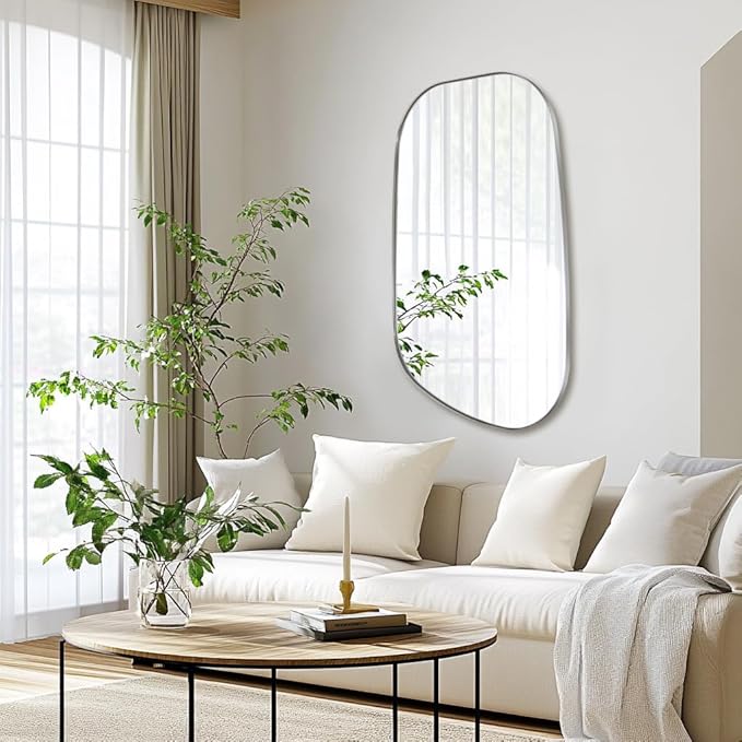 - Elegant Fluid Silhouette:This chrome mirror features a naturally curved asymmetric shape—where soft lines replace rigid symmetry for a sophisticated aesthetic. Perfect for bathrooms, entryways, or living rooms, it adds understated uniqueness to any space