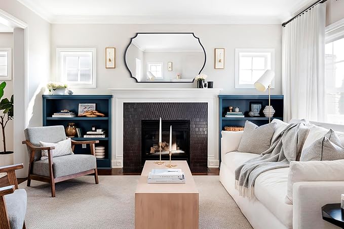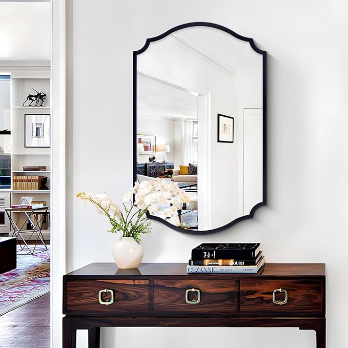 - 【Brief Arched Elegance】: Accent mirror captivates with its traditional arched scalloped design and antique black color, evoking the glamour of vintage decor pieces.