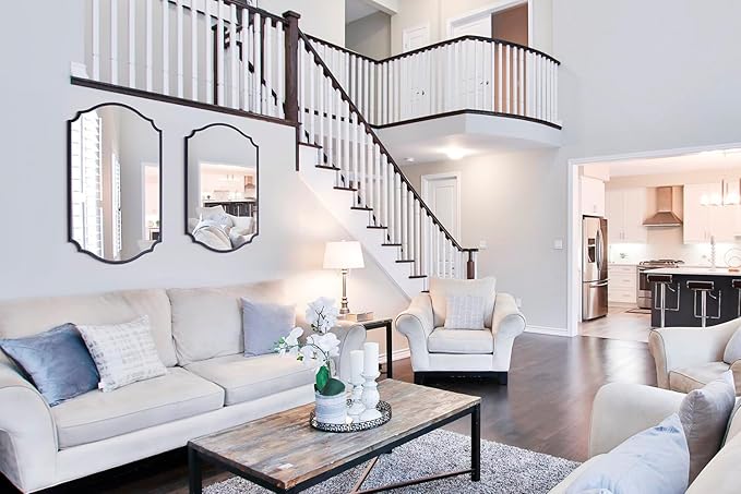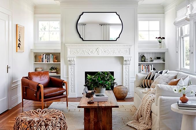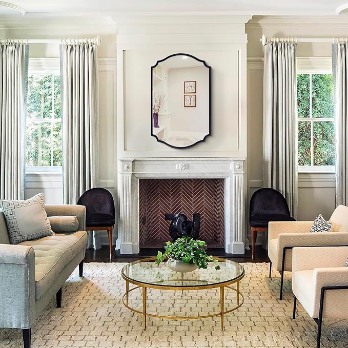 - 【Brief Arched Elegance】: Accent mirror captivates with its traditional arched scalloped design and antique black color, evoking the glamour of vintage decor pieces.