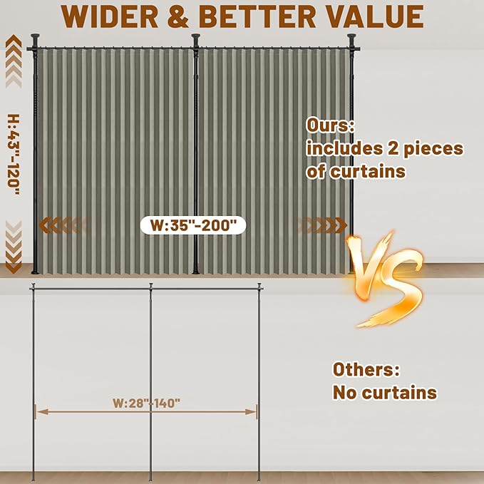 - No-Drill Tension Rod Included: Adjustable height & width, curtain rods no drilling, zero damage, perfect for renters or temporary walls.