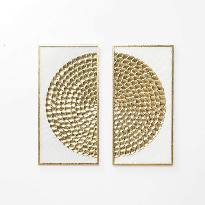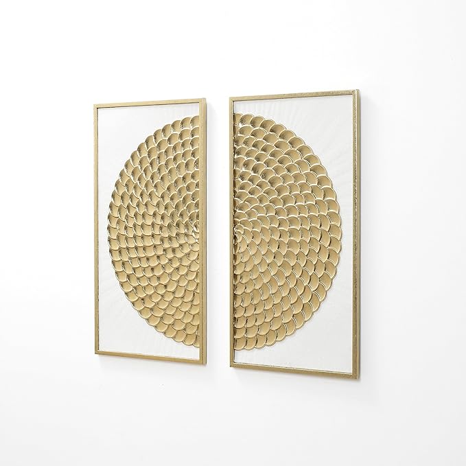 LuxenHome 34" Metal Wall Art, Set of 2 Living Room Gold Wall Decor, White & Distressed Metal Art Hanging Sculptures Decorations with Frame for Home, Bedroom, Entryway, Kitchen, Office, Dining Room
