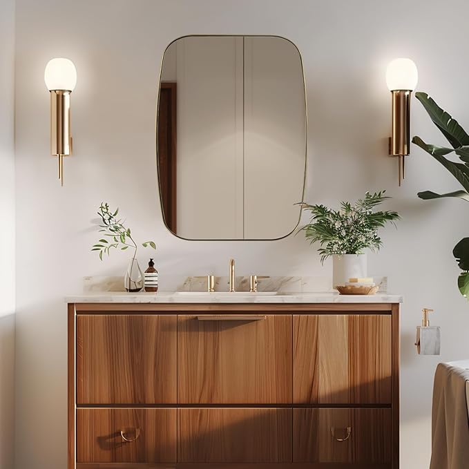 - Excellent Performance: A sleek, modern stainless steel metal frame surrounds a unique oblong mirror; sets it apart from traditional oval or rectangular mirrors; brushed gold finish complements your bathroom; adds light and space to the room