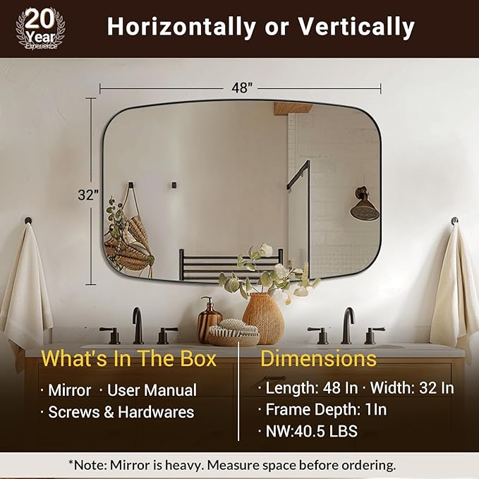 - Transform Spacious Environments: Redesign your spacious bathroom with the large 32x48 inch mirror. Its generous size and premium craftsmanship create a luxurious feel, reflecting light and space to amplify the room's aesthetic appeal and functionality