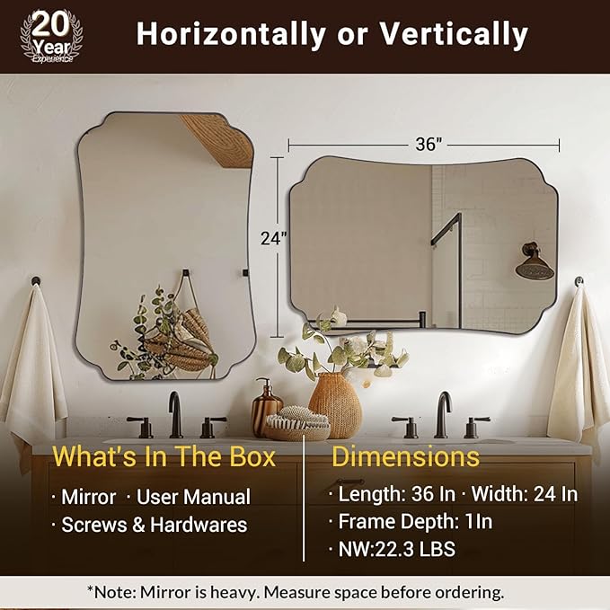 - Versatile Use: Perfectly suited for various spaces, including bathrooms, bedrooms, and living rooms; its flexible design allows for creative placement options; be it modern, minimalist, farmhouse, or eclectic—this scalloped edg mirror elevates your space with distinctive charm and artistic flair