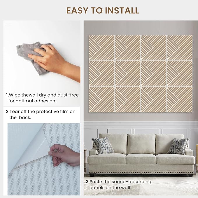 - Easy Self-Adhesive Installation: Each sound absorbing panels comes with a strong self-adhesive backing. Just peel and stick the sound absorbing panels to the wall. No tools or professional help needed