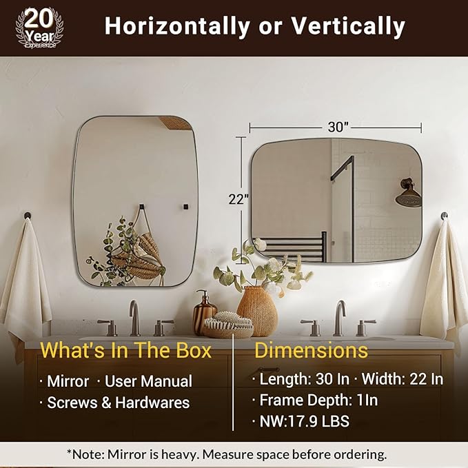 - Maximize Limited Wall Areas: Maximize your bathroom's wall space with the 22 x 30 inch mirror. Its versatile size and clear, distortion-free reflection make it perfect for narrow spaces, offering both practicality and aesthetic appeal in confined areas