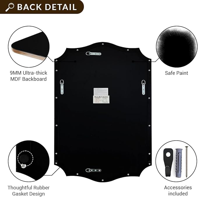 - 【Excellent Packaging & Easy Installation】: This scalloped mirror for bathroom is fully protected in packaging, including a PE bag, poly foam, and master box, to ensure it arrives in perfect condition. Our wall-mounted mirrors pass the 10-point drop test and come with four pre-installed hooks, making it easy to install both horizontally or vertically