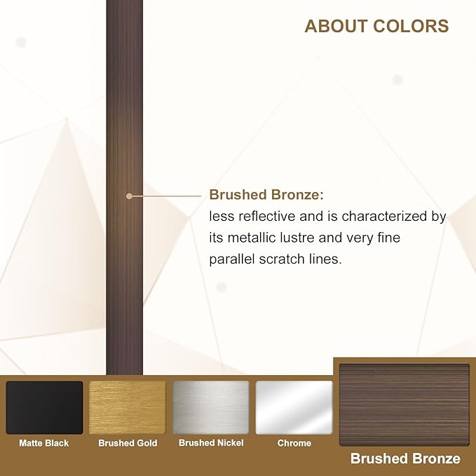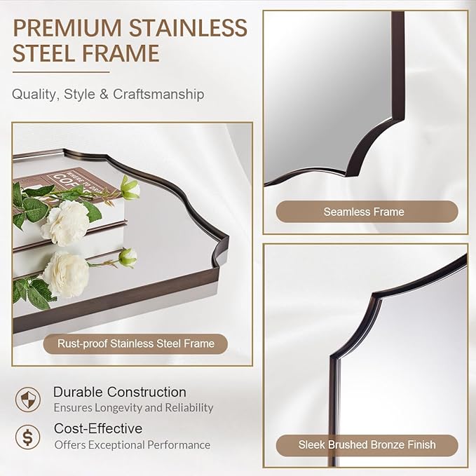 - 【Premium Stainless Steel Craftsmanship】: (N.W:34.9LBS). Crafted from stainless steel metal with oxidation-resistant properties, this brushed bronze bathroom mirror offers enhanced stability and a longer lifespan. Shatterproof 4mm HD glass is supported by a 9mm MDF backboard (most others just 3mm ), surrounded by a 1/17" gap with unique curved corner design to give a seamless finish