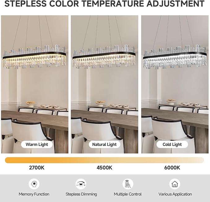 - [Customizable Color & Brightness]:Tone Control:Black modern crystal chandeliers for dining room instantly switch between warm white (3000K) and cool daylight (6500K) using the wall switch.Dimmer Control:Modern Chandelier for bedroom living room adjust brightness levels seamlessly via the included remote.(Requires remote not compatible with standard dimmer switches)