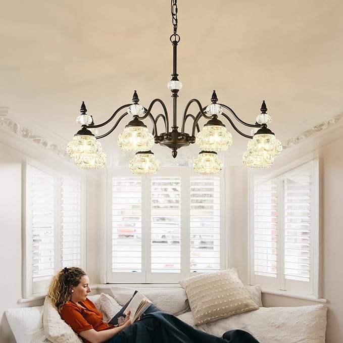 - Exquisite & Unique Design -- Skilled craftsmen meticulously craft the vintage crystal chandelier. As a perfect blend of elegant appearance and sturdy material, this black vintage chandelier has a flower-shaped glass shade, which shows a wonderful lighting effect that can bring a warm, romantic, luxurious feel to your home