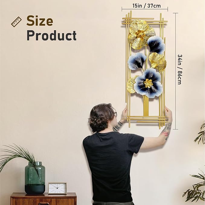 Metal 3D Wall Art Decor 2 Pcs 34" x 15" Wall Decor Handmade Golden Ginkgo Leaf Blue Flower Hanging Home Decor Wall Sculpture Modern for Living Room, Bedroom, Dining Room, Office and Hotel Large