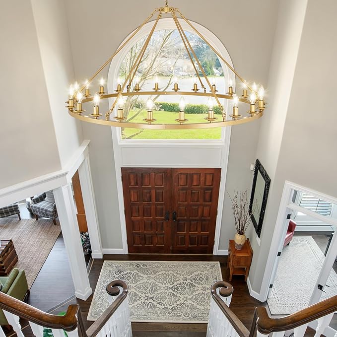- 【53inch Gold Farmhouse Chandelier】All arms are pre-wired and pre-threaded. The foyer chandeliers entryway light fixture is easy to install, simply put the wagon wheel together, providing with good quality combination connectors make the wires easy to assemble. Also we packaged included mounting hardware and detailed installation instructions for the fast. Kindly Note: Please make sure you have cut off the electricity supply before installation.