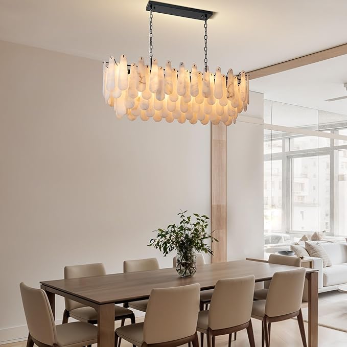 Chandeliers for Dining Room, L47.2 in Modern Alabaster Rectangle Black Chandelier, 4-Tiers Luxury Natural Stone Ceiling Light Fixture, White Marble Chandeliers for Kitchen Island Living Room Bedroom
